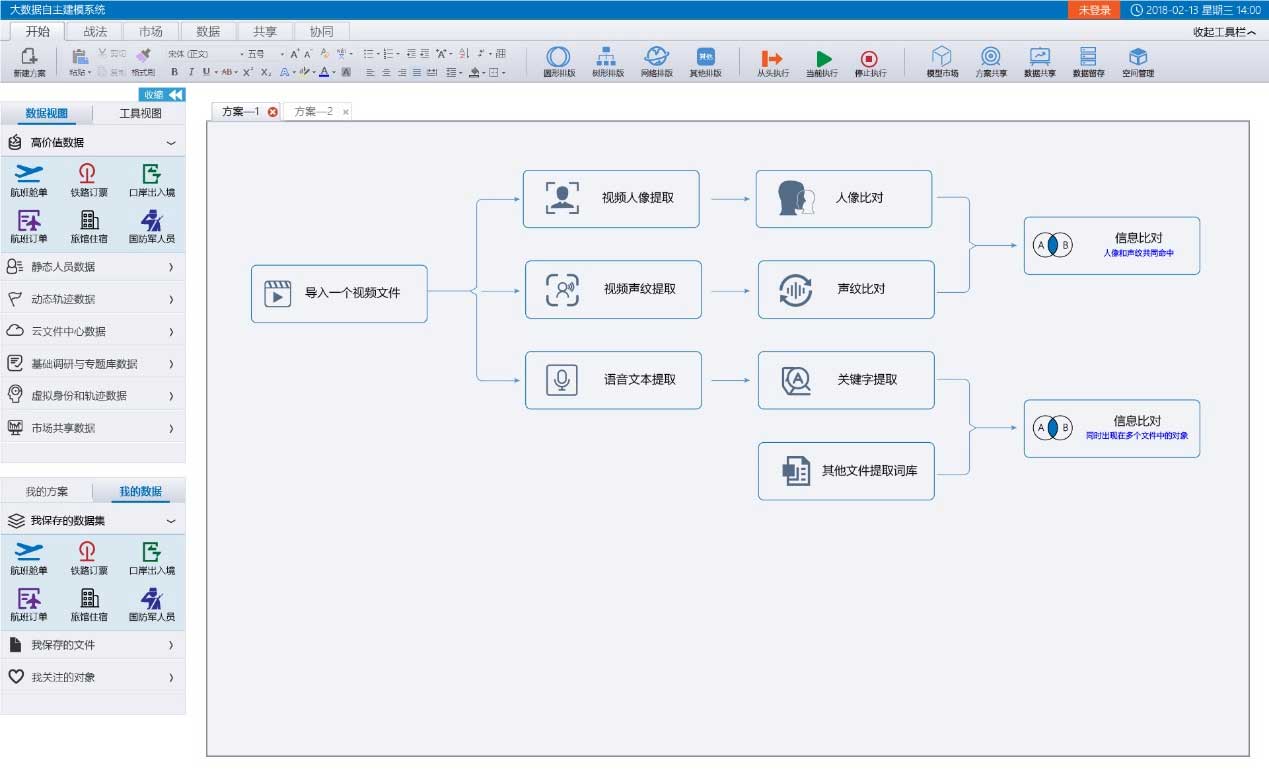 1、為用戶提供完全自由的思維推演平臺,遞進式交互分析過程高度靈活與自主設計,用戶可以用自己的分析思路操作、分析、挖掘海量數據資源。 2、可以直接獲取同網絡內各類數據接口、關系數據庫、云平臺、文件數據資源,本地臨時數據資源、第三方平臺數據,集成用戶方的所有可訪問數據資源。 3、可同時驅動結構化數據、半結構化數據、文本數據、人像數據、視音頻數據,實現多源異構數據的混合建模、混合推演。 4、建立一套邏輯數據模型,可以將不同網絡、不同存儲類型、不同存儲位置、不同數據種類的各種對象、要素、碼址、關系有機的整合起來,與專家庫系統進行統一識別和關聯。 5、建立對數據資源、目標名單、專家庫知識(戰法、模型、其他)的統一安全管理體系,包括:功能授權、數據授權、知識授權、范圍授權、時間授權、實時審計、事后審計、績效統計等。 6、建立對數據集合的多維展示、分析、探索能力,包括但不限于集合列表、多維統計、關系視圖、GIS展示等。 7、建立專家庫系統,創建業務戰法、模型、經驗共享應用的生態圈,提供業務創新土壤;通過授權等安全控制后,模型可以直接發布使用或被第三方系統調用。